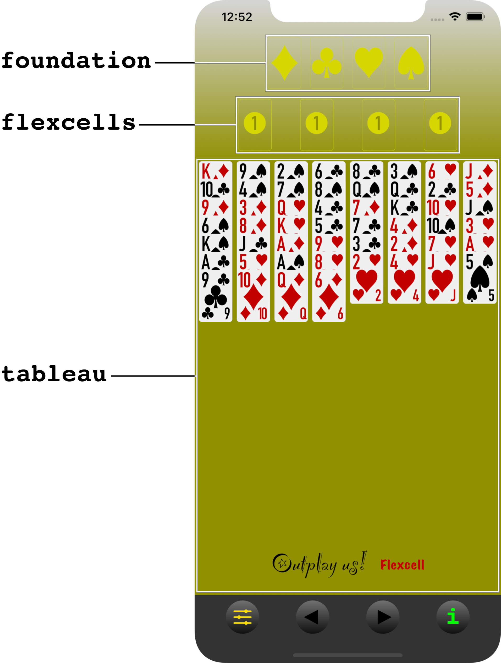 Cards can be temporarily placed ("packed") in the tableau alternating color (red-black) and in descending order (K-A).