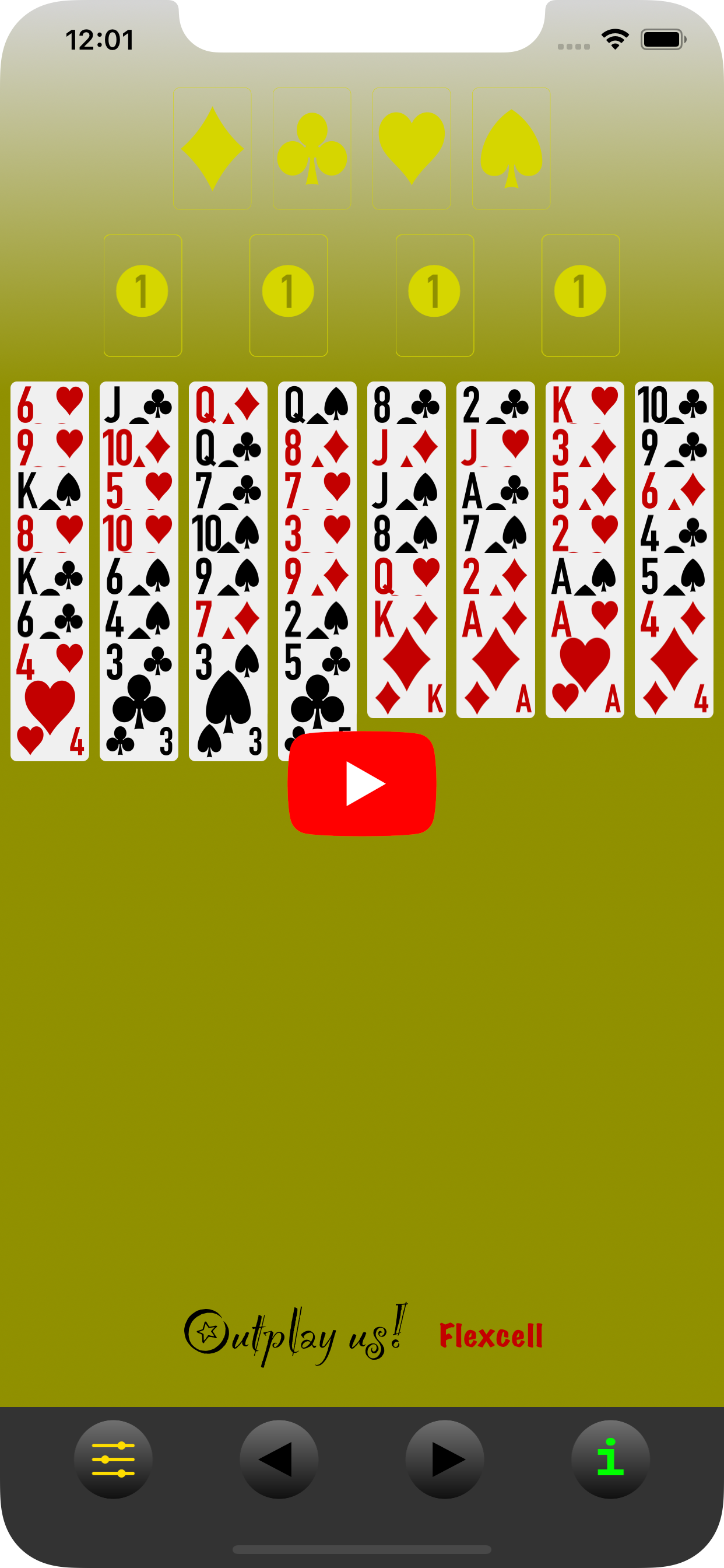 The goal of the game is to move ("build") all cards to the foundation, sorted by suit (diamonds, clubs, hearts, spades) and in ascending order (A-K).