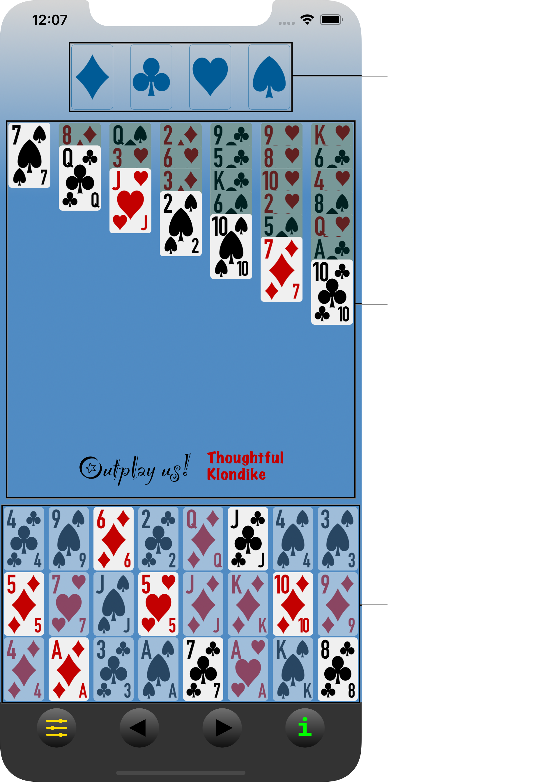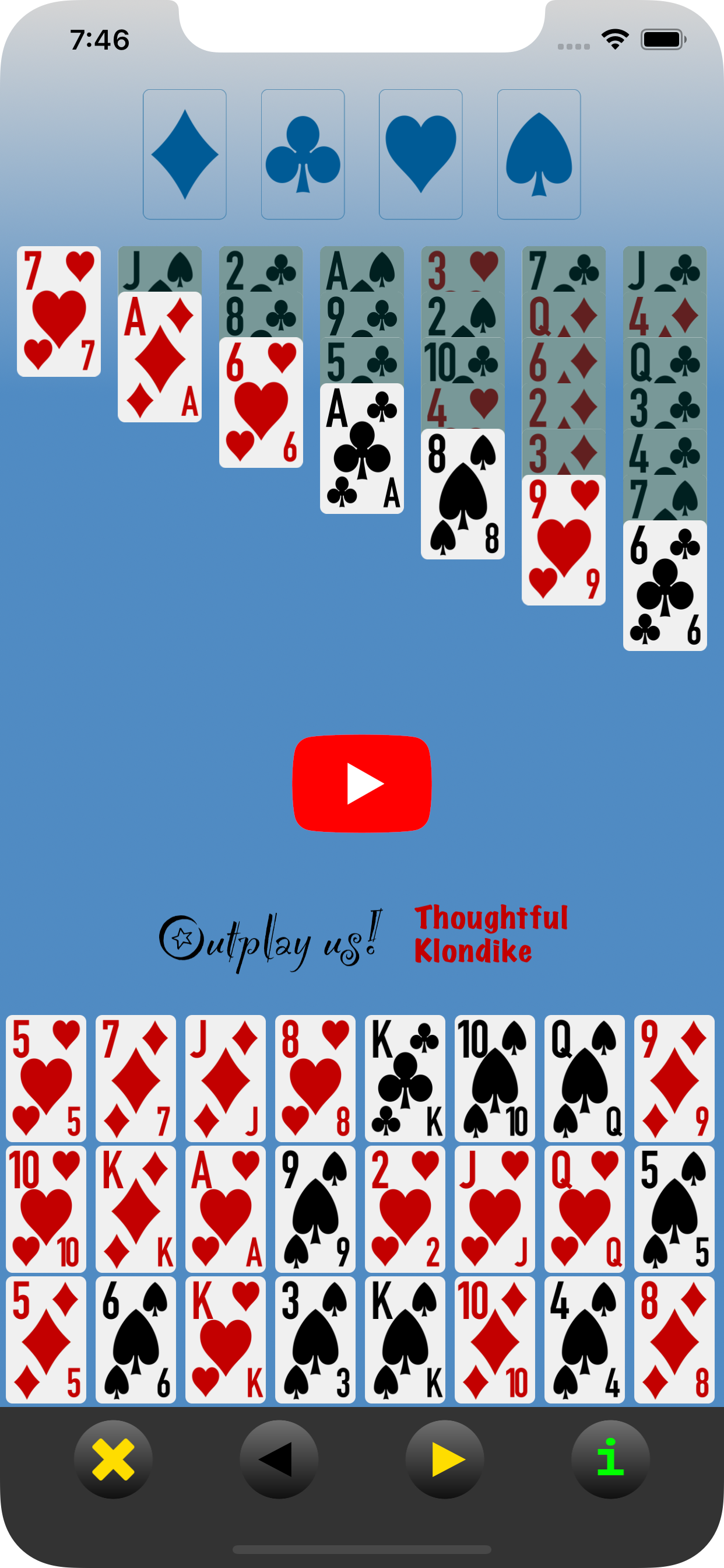 Just like in regular Klondike, the goal of the game is to move ("build") all cards to the foundation, sorted by suit (diamonds, clubs, hearts, spades) and in ascending order (A-K).