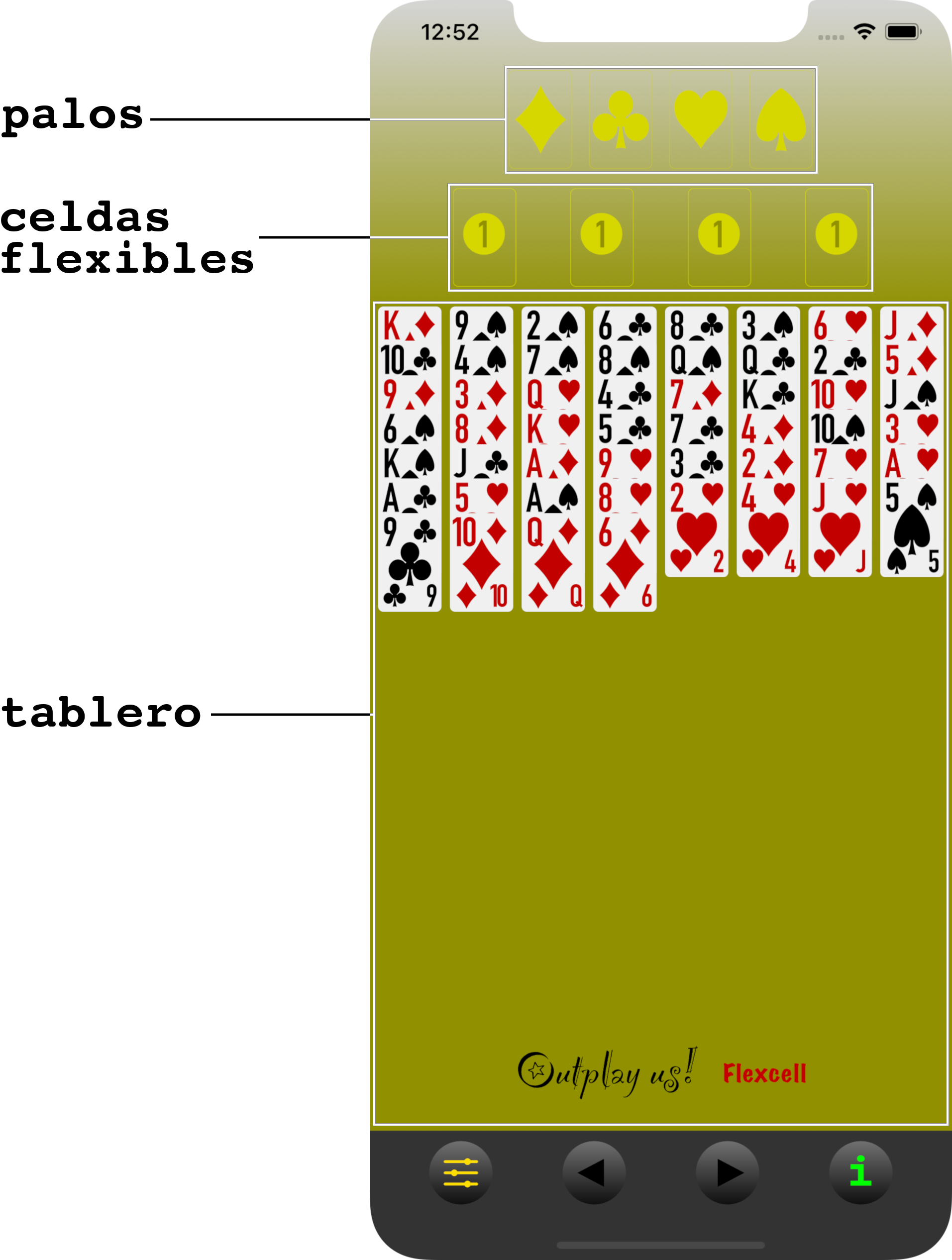 El objetivo es mover todas las cartas a la base, ordenadas por palo (diamantes, tréboles, corazones y picas) y en order ascendente (A-K).