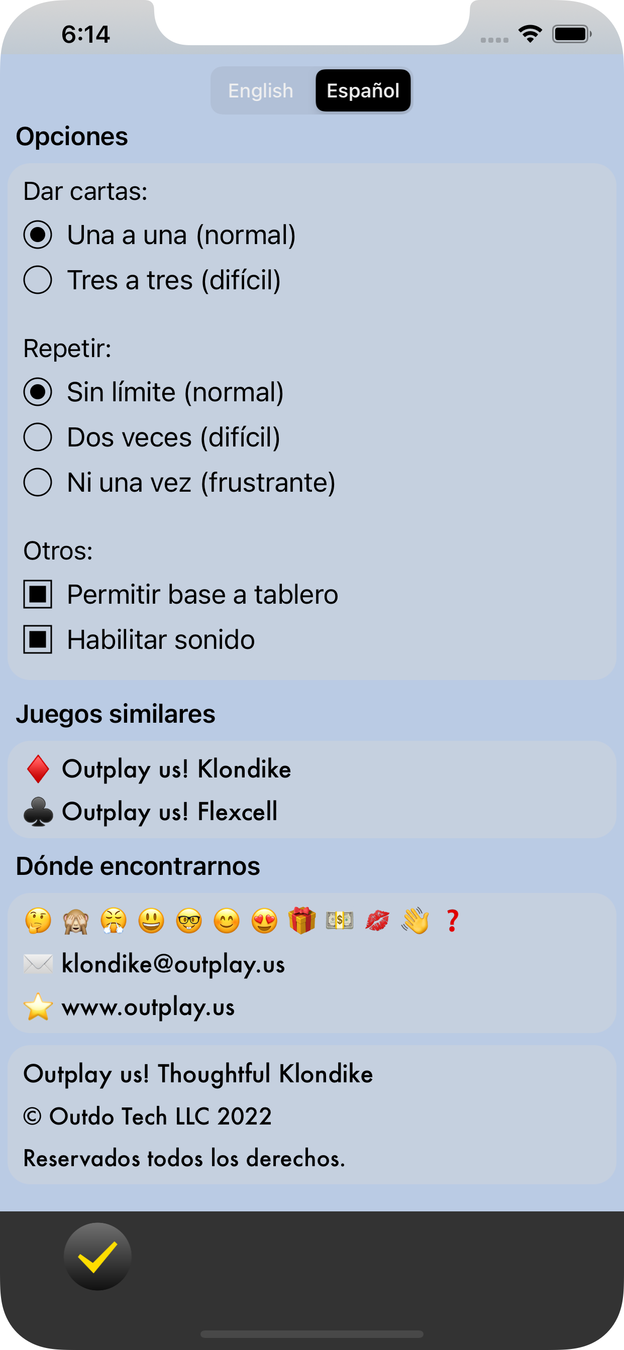 Información acerca de Outplay us! Klondike. (Este botón puede usarse en cualquier momento sin afectar el estado de la mano en curso.) |